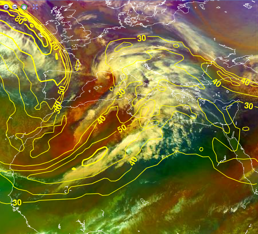 Figure 4: MSG Air Mass RGB with isotachs [m/s] at 300 hPa, 30 January 2014, 12 UTC.