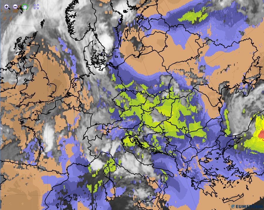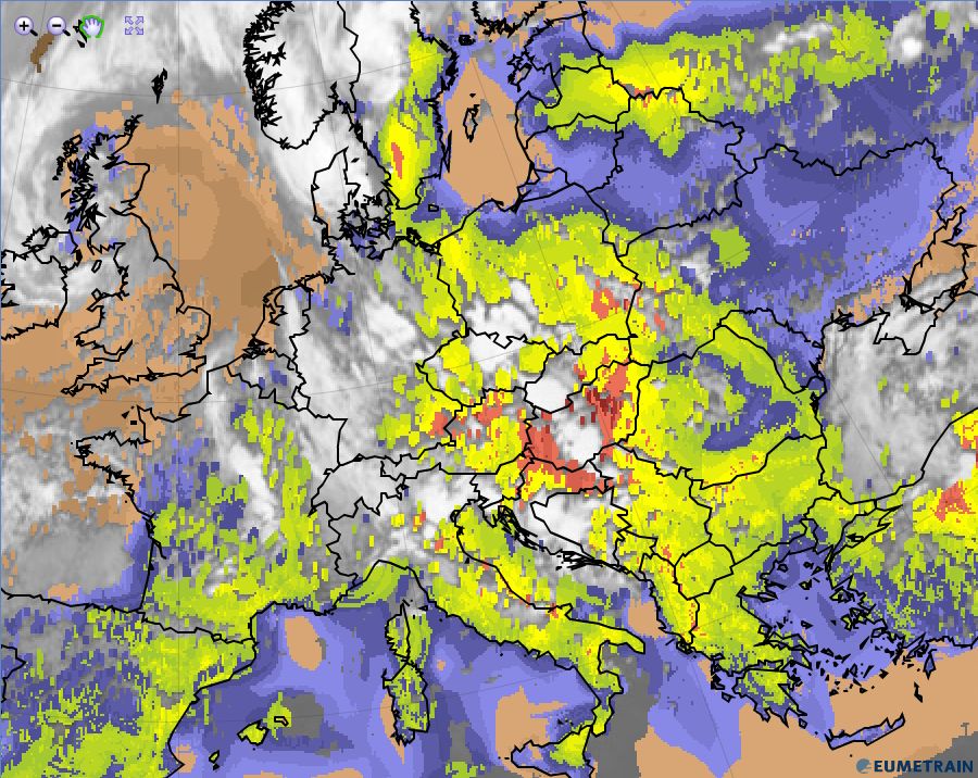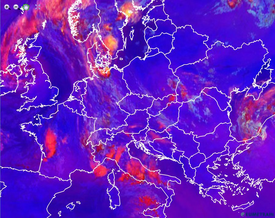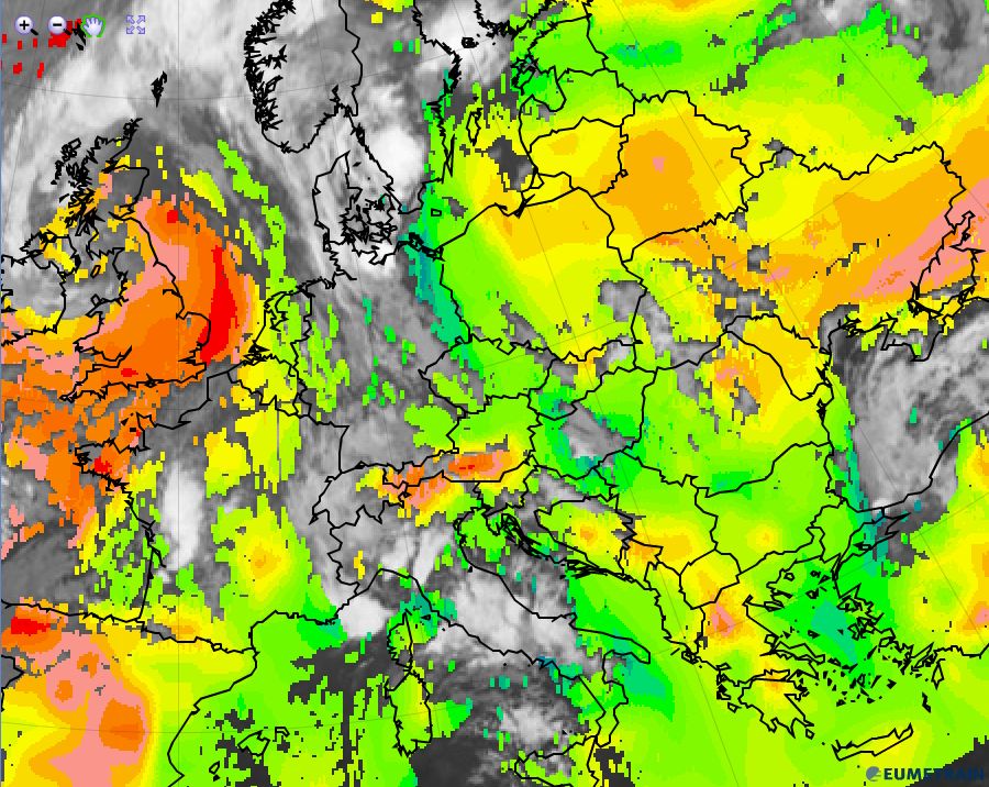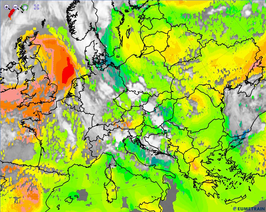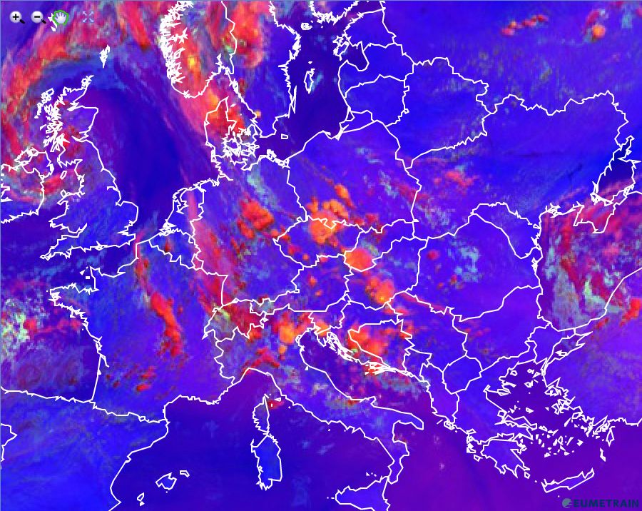 The yellow-orange colour within Scandinavian MCS is a sign of high activity in contrast to the more reddish cells over Italy.