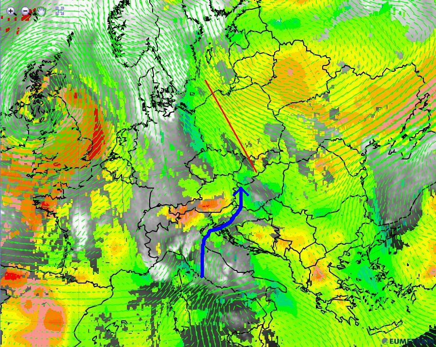 During the phase of maximum precipitation and snowfall activity, we can identify the rising warm and moist air masses over continental cold air over northern Italy, Slovenia and the southern part of Austria. The formation of a warm front is a clear sign for this process. On the first of February a second cold air outbreak over western Europe boosts the northward stream over central Europe.