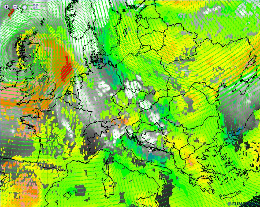 The GEO TPW product at 06 UTC shows a high amount of precipitable water in the region corresponding to the lowest LI values. Hence, we can expect that once convection initiates in the instability band reaching from southern Sweden to Greece, the high amount of water vapour (moisture) would be readily available to produce heavy rainfall. Of special interest is a region in the eastern Alps (South Tyrol and southern Austria) with very low TPW values right in the middle of high TPW values and surrounded by active convective cells. As this minimum of TPW is not reflected in 6.2 µm WV images, the relatively low amount of moisture results from the elevated terrain.