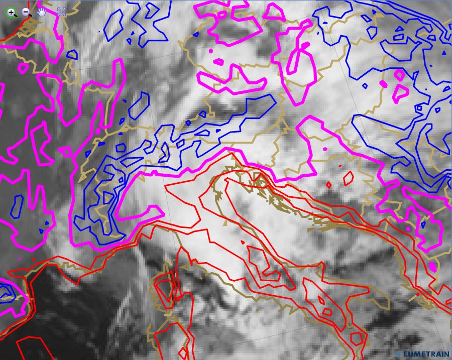 The TPW anomaly product shows the propagation of moist air as it crosses the Sahara and the Mediterranean (yellow colours in Figure 11). This unusually high amount of TPW reaches the south face of the Alps by 1 February 2014. The advection of total atmospheric moisture is further enhanced by the approach of another cold front caused by a second cold air outbreak over western Europe. This approaching cold front can be tracked in the above loop as a band with unusually high TPW arriving from the west.