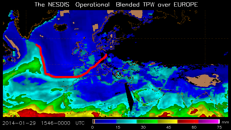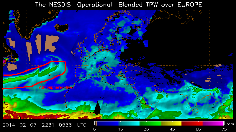 Figure 2: The NOAA NESDIS operational blended TPW product. The red line circumscribes an atmospheric river heading towards Europe, 7 February 2014.