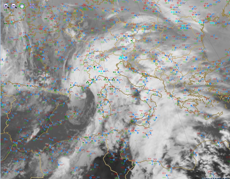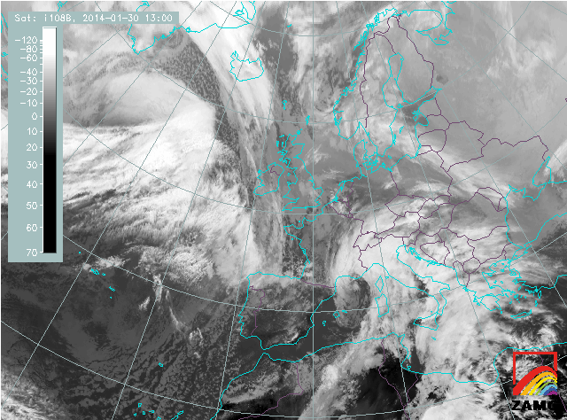 Figure 6: MSG SEVIRI 10.8 µm image and synoptic observations from 30 January 2014, 12 UTC. Click on the image to enlarge it.