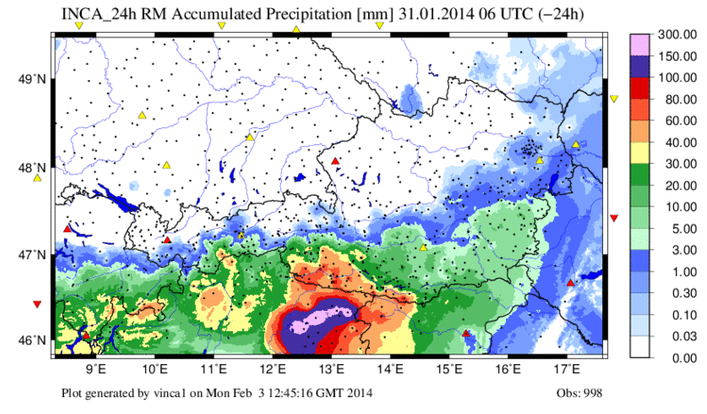Figure 13 shows the 24-hour accumulated precipitation from 06 UTC on 30 January to 06 UTC on 31 January 2014. The highest amounts of precipitation can be found in the tri-border region of Italy, Slovenia and Austria. Note the strong gradient parallel to the mountain crest.