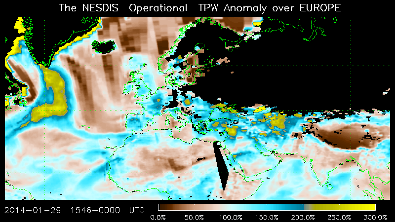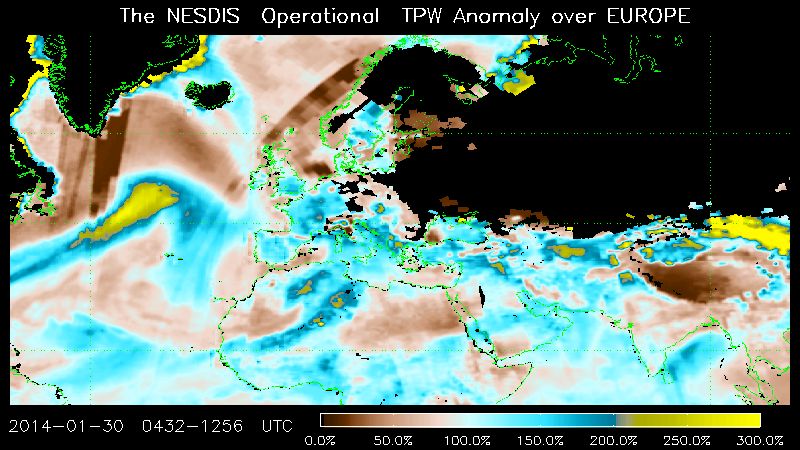The above TPW anomaly product loop (Figure 9) shows the cold and dry air propagating towards the south. Along its eastern part, we can identify a moist band with TPW values of about 150% above normal. The plume of tropical air over Africa, advected from the south, is well depicted towards the end of the loop exceeding values of 200% over normal.
