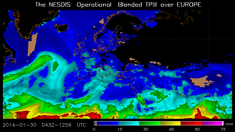 Figure 9: NOAA NESDIS operational TPW anomaly product loop (29 January 2014, 00 UTC to 30 January 2014, 12 UTC). The brown contour line shows the region of high TPW advected to the north.
