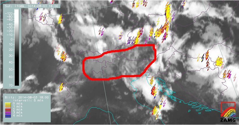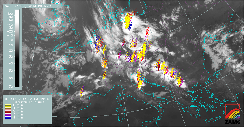 Figure 21: IR 10.8 µm satellite image from 3 August 2014, 18 UTC and 5 minutes interval lightning data superimposed.