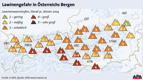 Figure 14: Avalanche risk for the region of the Austrian Alps reaching from 1 (low) to 5 (very high) for 31 January 2014.
