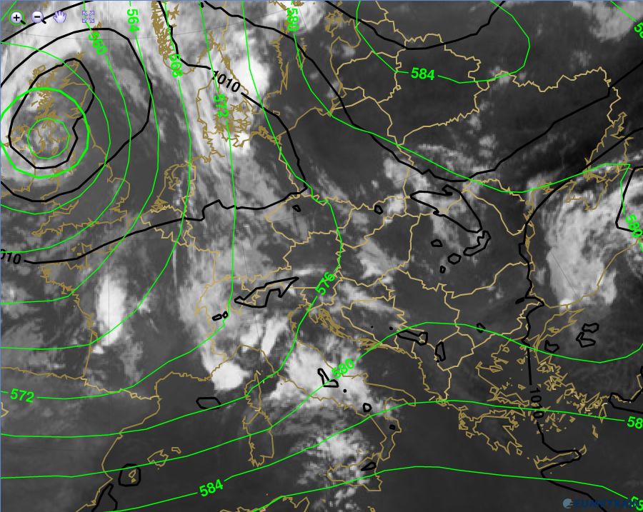 Figure 16: MSG SEVIRI IR 10.8 m image with ECMW surface pressure in hPa(black) and 500 hPa geopotential height in decameters (green) on 3 August 2014, 06 UTC.