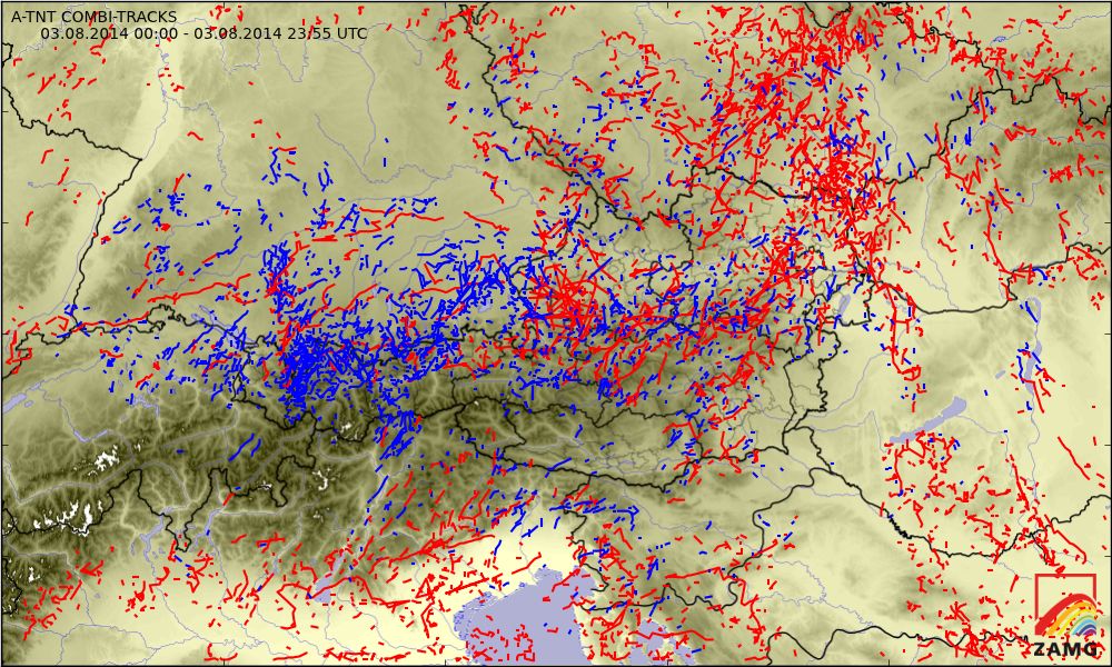 Figure 20: Convective cell tracks from Radar and lightning data for 3 August 2014. Red lines represent cells with confirmed lightning, blue tracks represent cells with rain only.