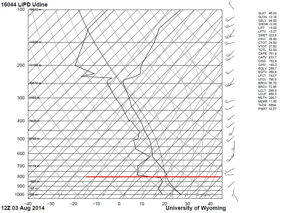 Figure 19: 12 UTC radiosonde data from Udine (NE-Italy) station (3 August 2014). The red line marks the inversion height.