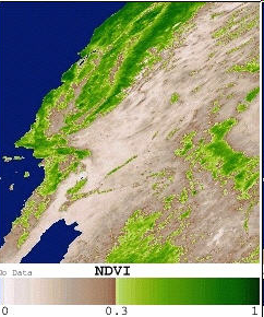 For land targets the index ranges from values close to 0 for arid or barren areas to ~ 1 for densely vegetated areas. Negative values of NDVI usually correspond to urban areas. The NDVI over water surfaces is very close to -1 due to their very low reflectance in the NIR band.