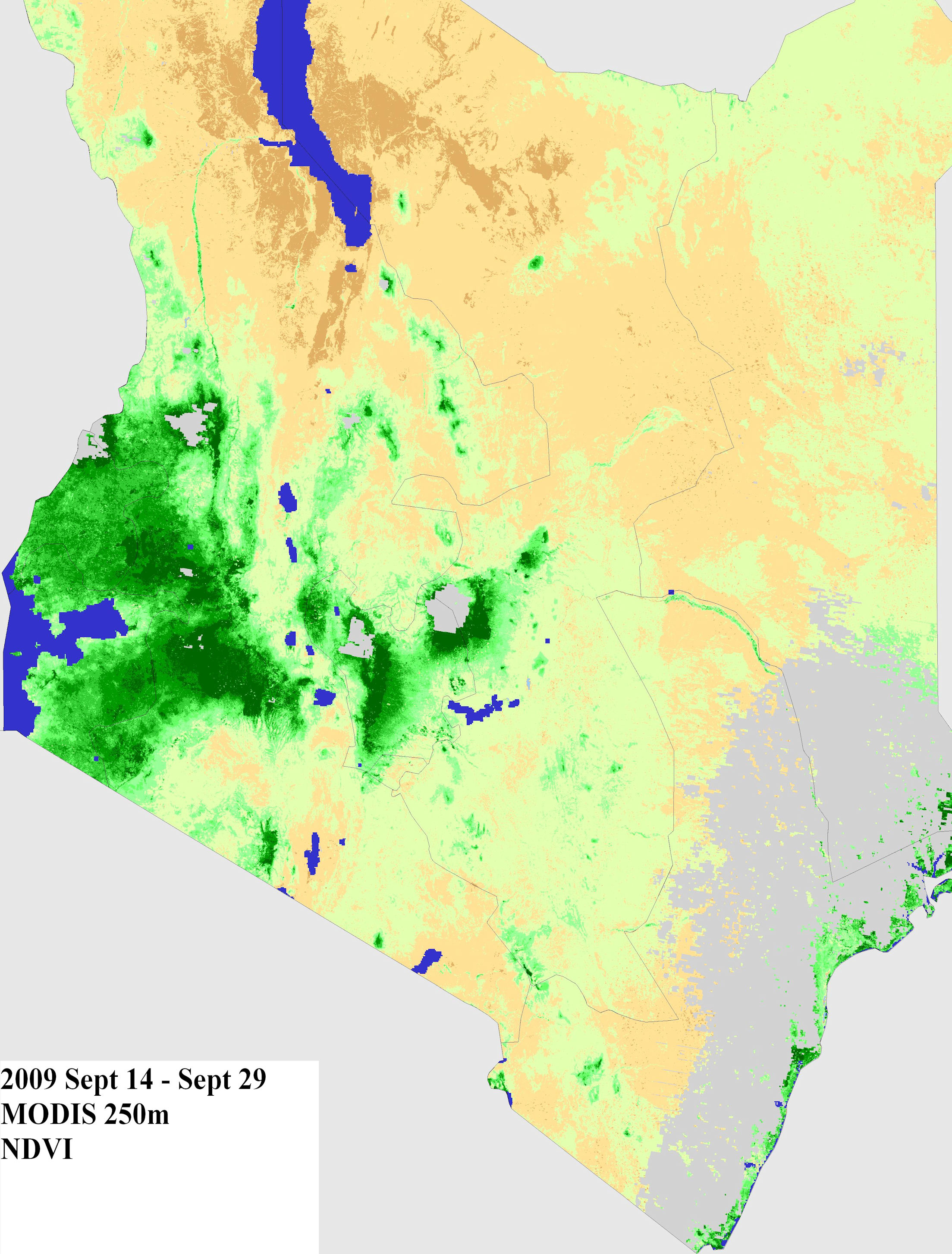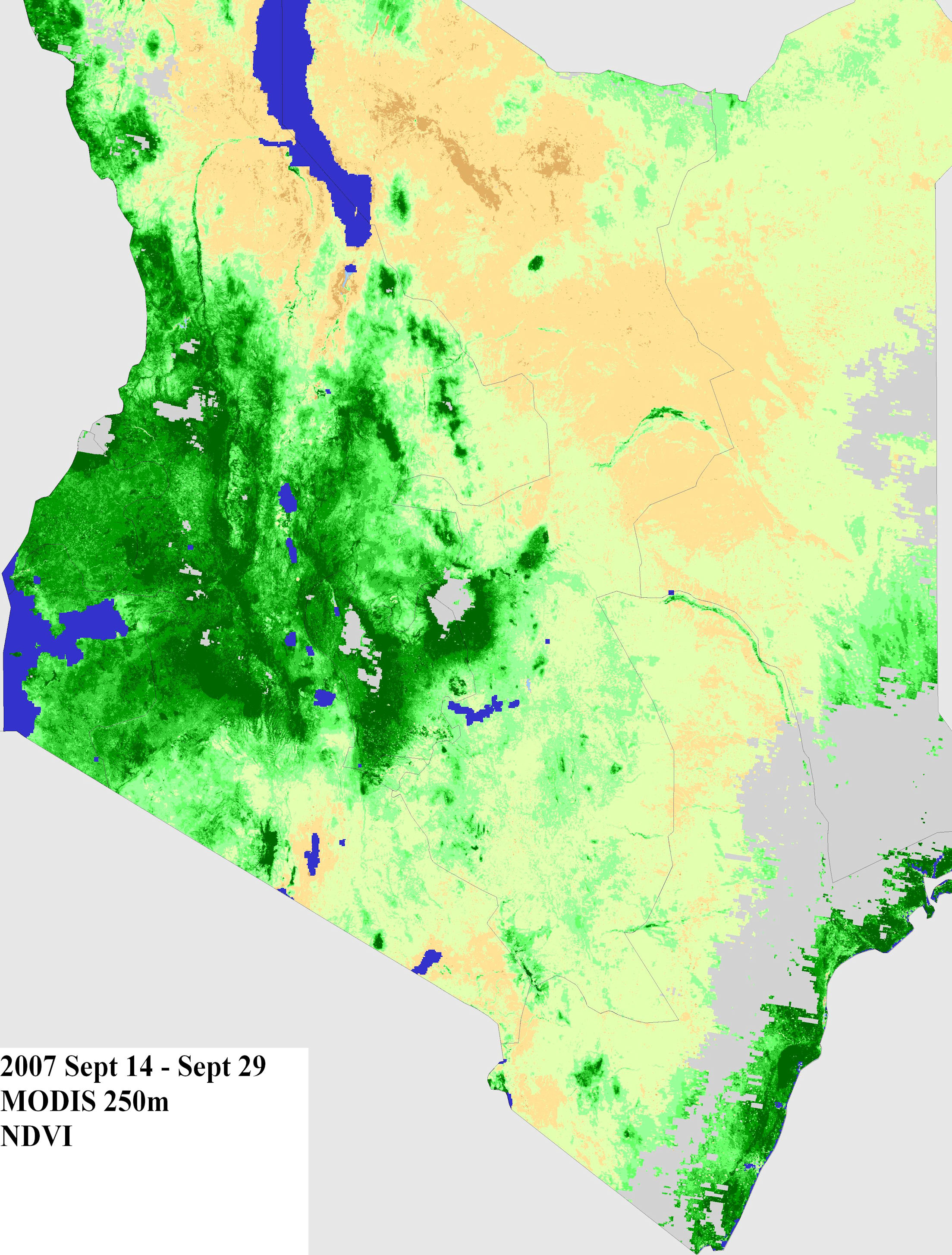 The amount of precipitation of Kenyas 2009 "long rains" season was well below the climatological average and also under the 2008 "long rains", which was also a dry year. The figure shows the MODIS NDVI 16-day composite for the period between Sep 14 and Sep 29 in 2007 (left panel) and in 2009 (right panel).