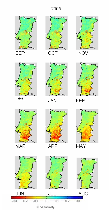 Next figure presents monthly NDVI anomalies for September 2004 - to - August 2005, defined as departures from the respective monthly medians. The latter statistics were obtained from NDVI time-series encompassing the September 1998 - to - July 2006 period, and derived from VEGETATION instrument onboard SPOT 4 and SPOT 5 (Gouveia, C. et al. 2009).