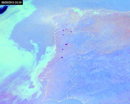 One of the biggest fires in Caramulo started as the result of arson. The first hot spot is visible on the Night Microphysics RGB at 20 August 2013 at 23:30 UTC (Figure 6). The Red beam is associated to the difference of IR 12.0 µm and IR 10.8 µm, the Green beam to difference between IR10.8 µm and IR3.9 µm and the Blue beam to the IR10.8 µm channel. The magenta color results from high values on the red and blue beams and low values on the green beam.