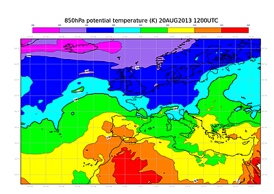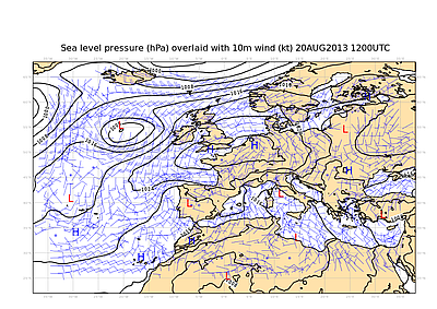 | Figure 4: ECMWF analysis a) mean sea level pressure and 10 m winds (in knots) and b) potential temperature at 850hPa. |