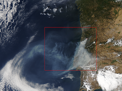 | Figure 7: This MODIS image shows the Caramulo fire on 29 August 2013. The fires are outlined in red, and dense smoke is drifting west over the Atlantic Ocean. Source: NASA Earth Observatory. |