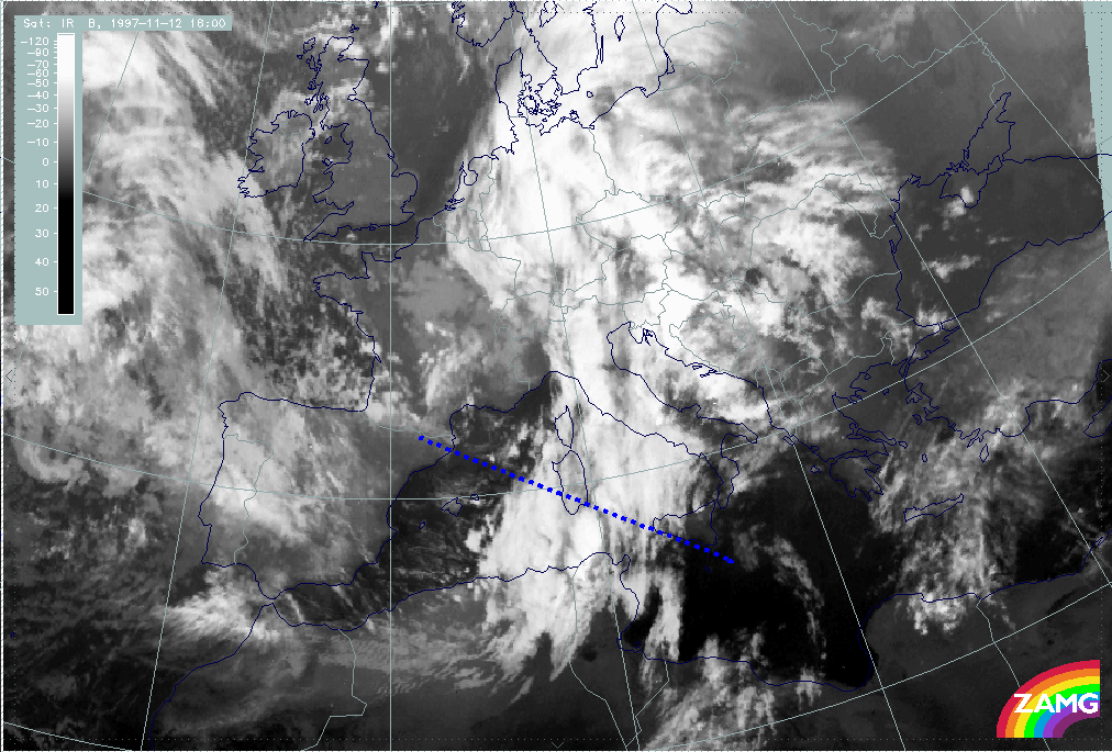12 November 1997/18.00 UTC - Meteosat IR image; position of vertical cross section indicated