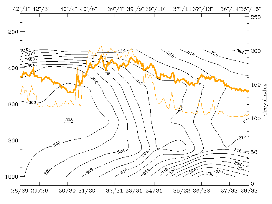 12 November 1997/18.00 UTC - Vertical cross section; black: isentropes (ThetaE), orange thin: IR pixel values, orange thick: WV pixel