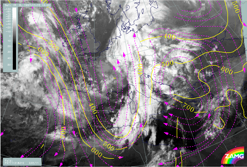 12 November 1997/18.00 UTC - Meteosat IR image; black: shear vorticity 300 hPa, magenta: relative streams 312K - system velocity