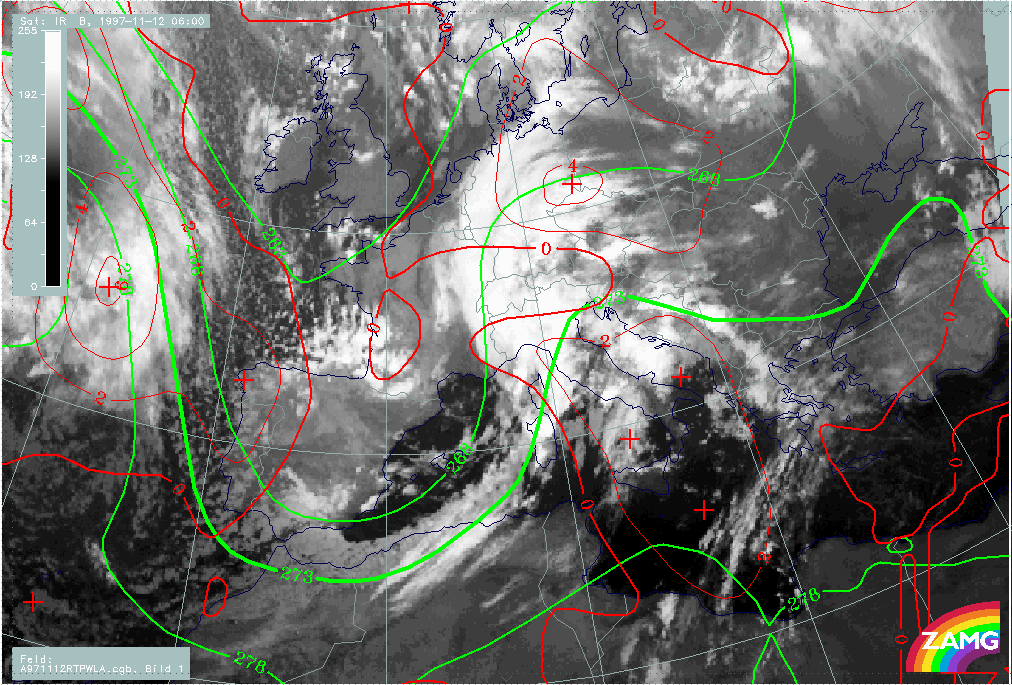 12 November 1997/06.00 UTC - Meteosat IR image; green: equivalent thickness 500/850 hPa, red: temperature advection - WA 1000 hPa