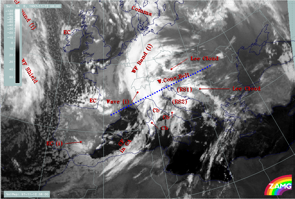 12 November 1997/06.00 UTC - Meteosat IR image; SatRep overlay: names of conceptual models; position of vertical cross section indicated