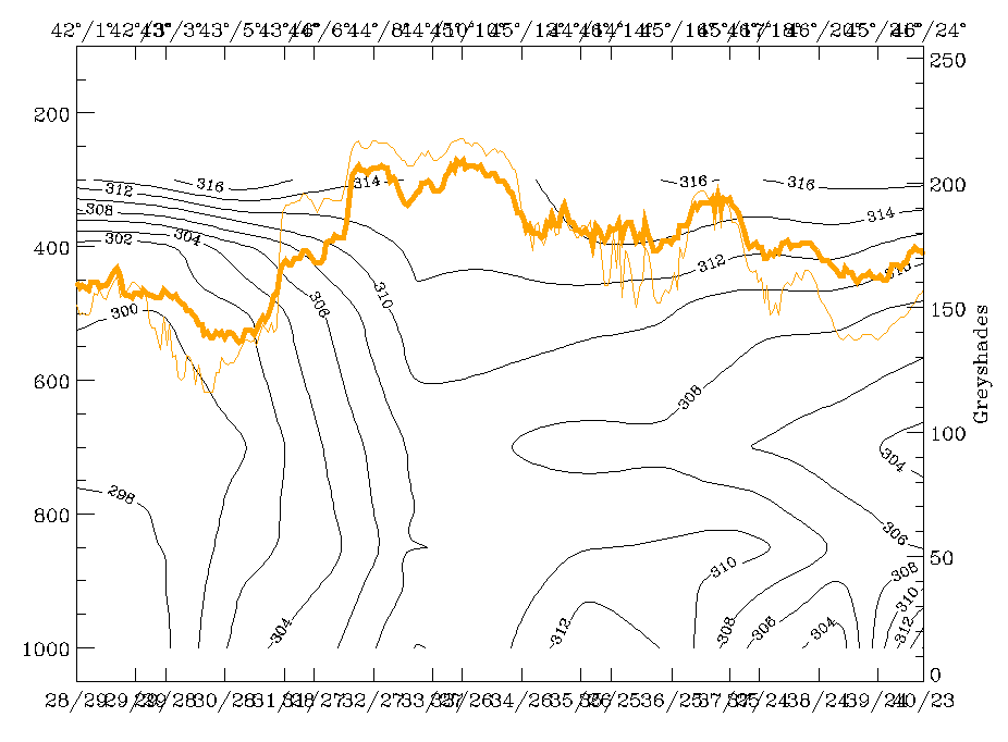 12 November 1997/06.00 UTC - Vertical cross section; black: isentropes (ThetaE), orange thin: IR pixel values, orange thick: WV pixel