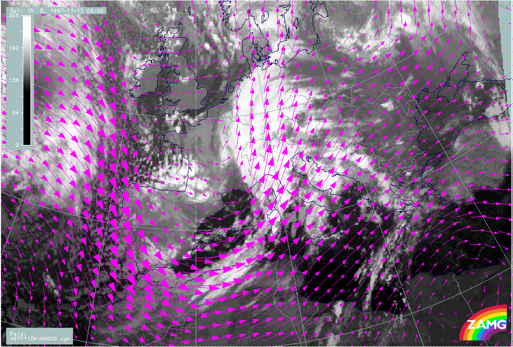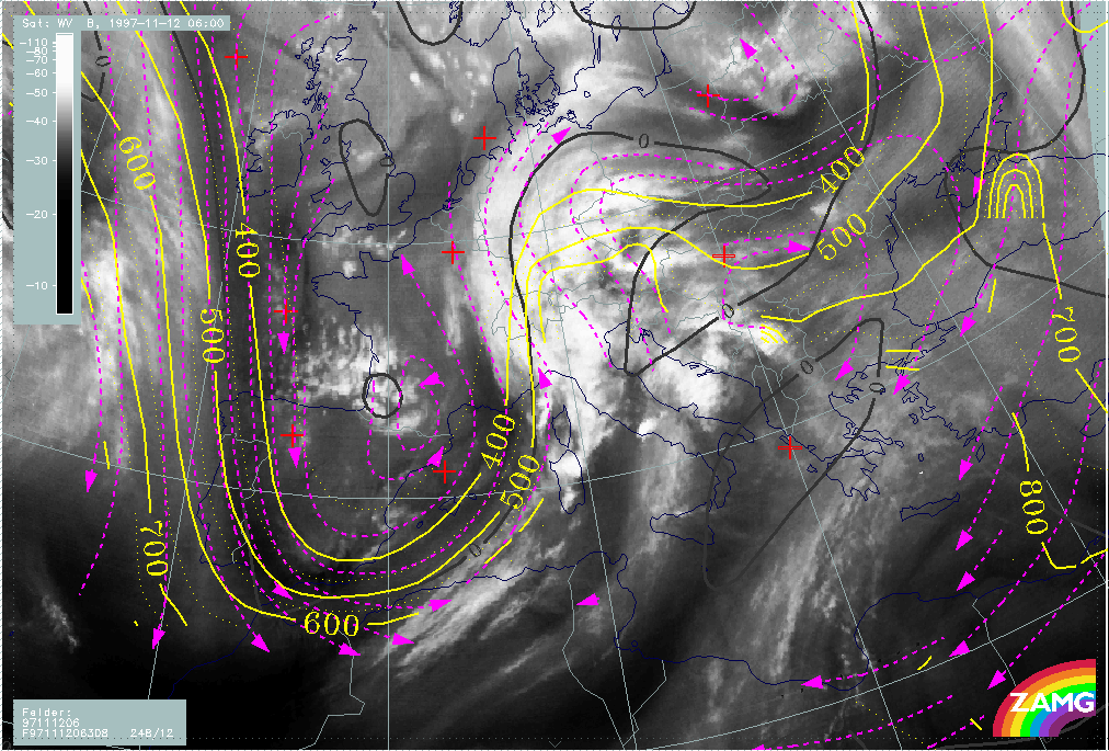 12 November 1997/06.00 UTC - Meteosat WV image; magenta: wind vectors 500 hPa