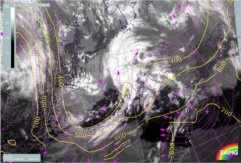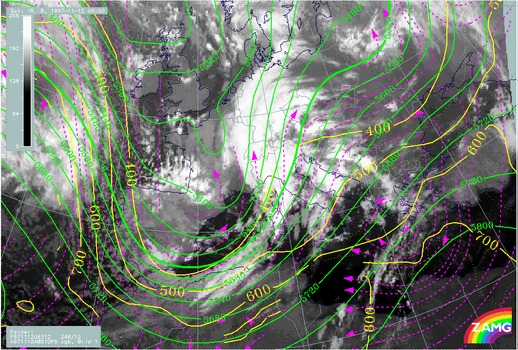 12 November 1997/06.00 UTC - Meteosat IR image; green: height contours 500 hPa, magenta: relative streams 312K - system velocity