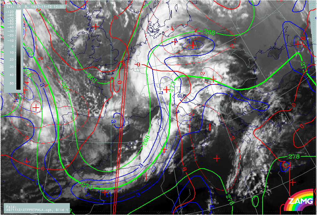 12 November 1997/12.00 UTC - Meteosat IR image; blue: thermal front parameter (TFP) 500/850 hPa, green: equivalent thickness 500/850