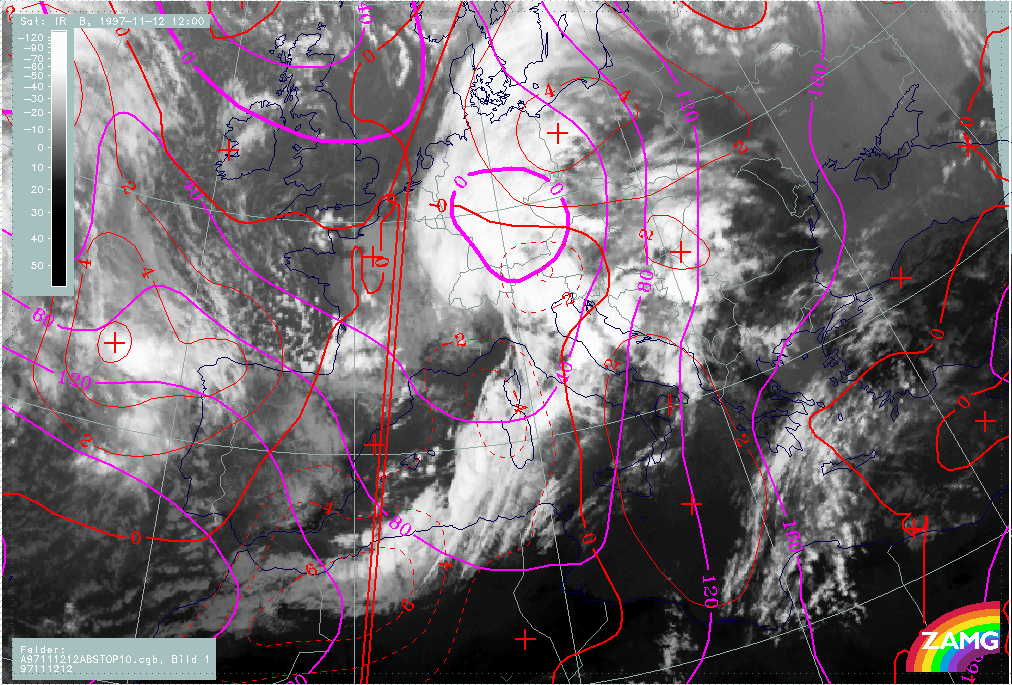 12 November 1997/12.00 UTC - Meteosat IR image; magenta: height contours 1000 hPa, red: temperature advection 1000 hPa
