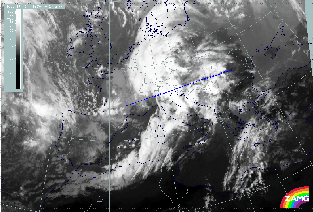 12 November 1997/12.00 UTC - Meteosat IR image; position of vertical cross section indicated