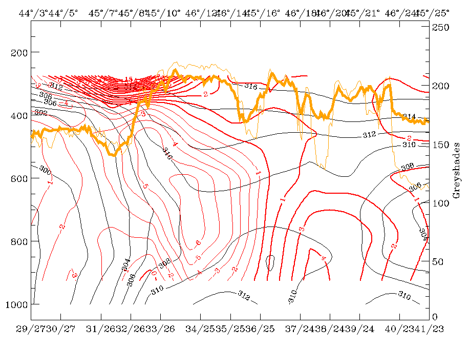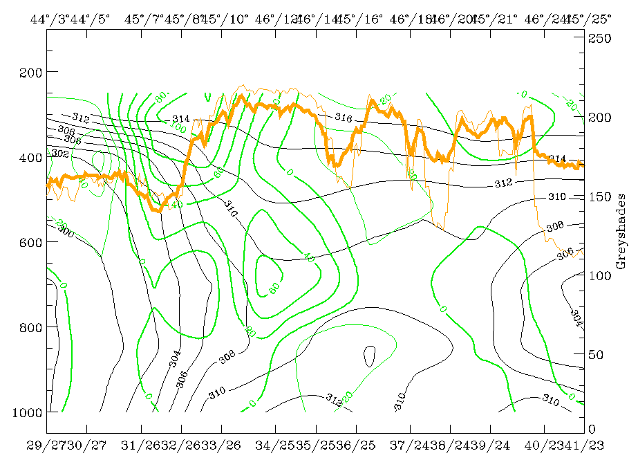 12 November 1997/18.00 UTC - Vertical cross section; black: isentropes (ThetaE), orange thin: IR pixel values, orange thick: WV pixel