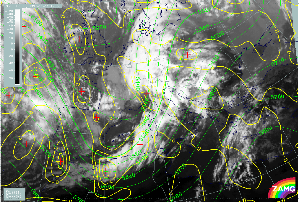 12 November 1997/12.00 UTC - Meteosat IR image; green: height contours 500 hPa, yellow: positive vorticity advection (PVA) 500 hPa