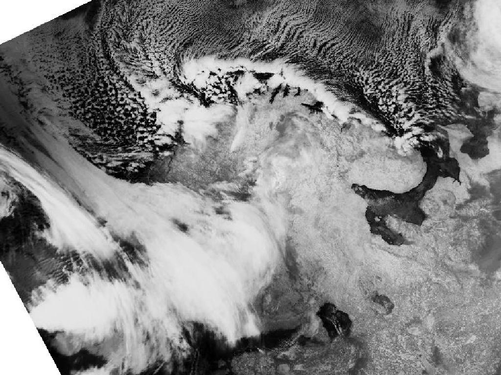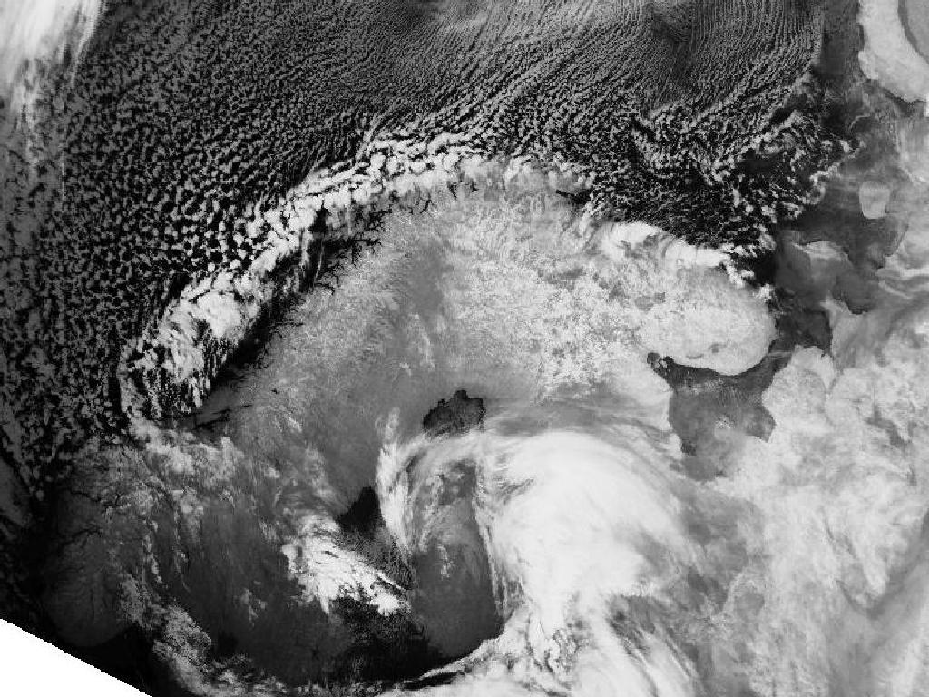 As the most striking cloud structure features were still located north of 60° latitude, the geostationary satellite data is not the best tool for visualizing the development of cloud systems. For this reason a series of consecutive NOAA satellite passes are shown in the following:
