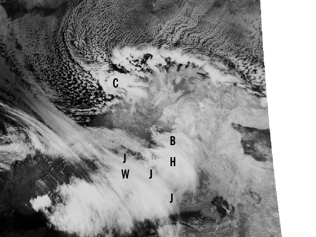 29 January 1998/16.16 UTC - NOAA CH4 image; B: cloud bulge, C: Comma, H: cloud head, J: Jet Fibre Cloudiness, W: Wave