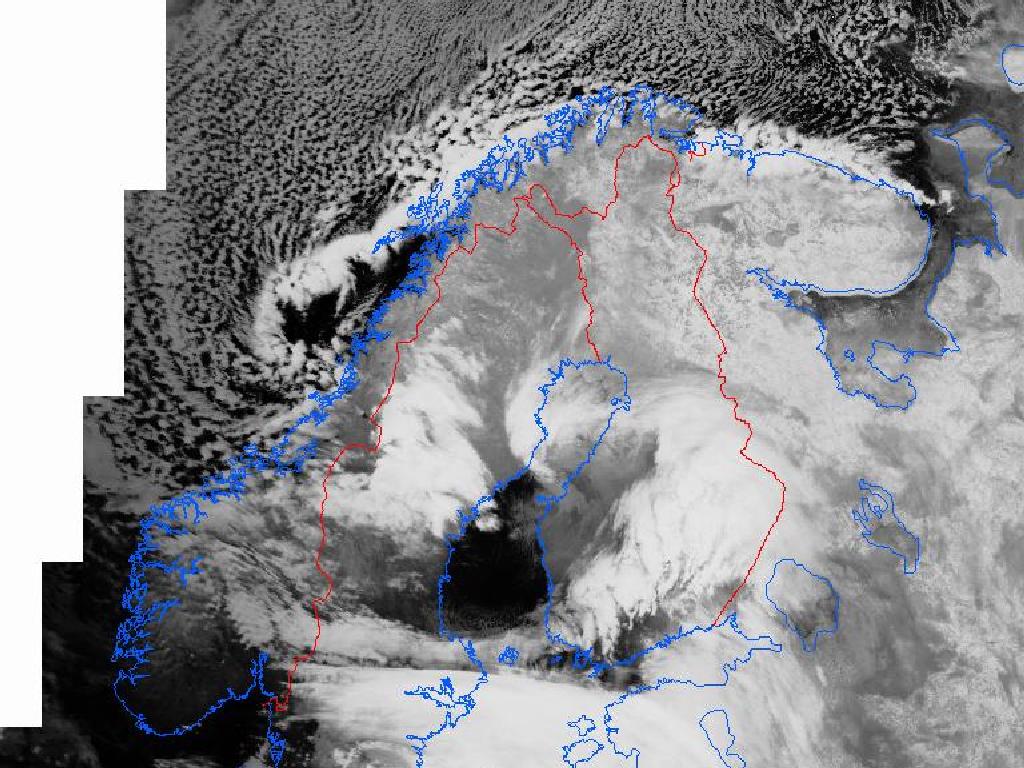 Unfortunately there is a several hours gap in NOAA passes during the evening and night. However, the first image for 30 January at 01.29 UTC (left image bottom) indicates that during the evening and night the system has developed considerably from a Wave into a cyclone with spiral cloudiness rotating around the vortex (centred in west Finland). The former head of the cloud is most probably seen almost as a separate hammer-like feature around 65N/22E.