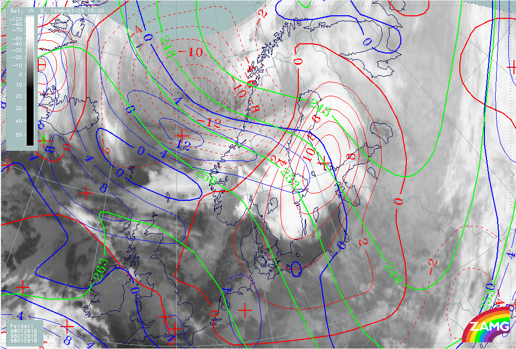 29 January 1998/18.00 UTC - Meteosat IR image; blue: thermal front parameter (TFP) 500/850 hPa, green: equivalent thickness 500/850