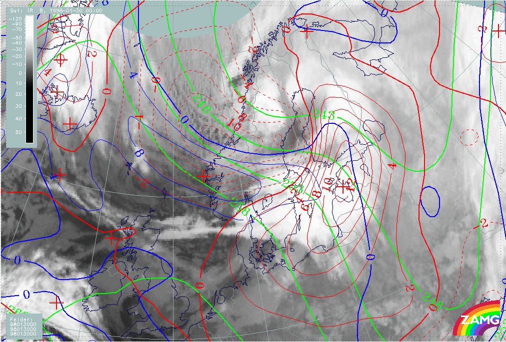 30 January 1998/00.00 UTC - Meteosat IR image; blue: thermal front parameter (TFP) 500/850 hPa, green: equivalent thickness 500/850