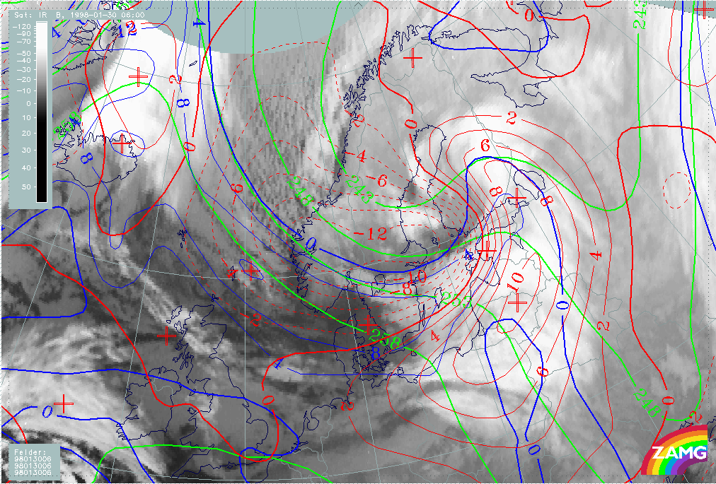 30 January 1998/06.00 UTC - Meteosat IR image; blue: thermal front parameter (TFP) 500/850 hPa, green: equivalent thickness 500/850
