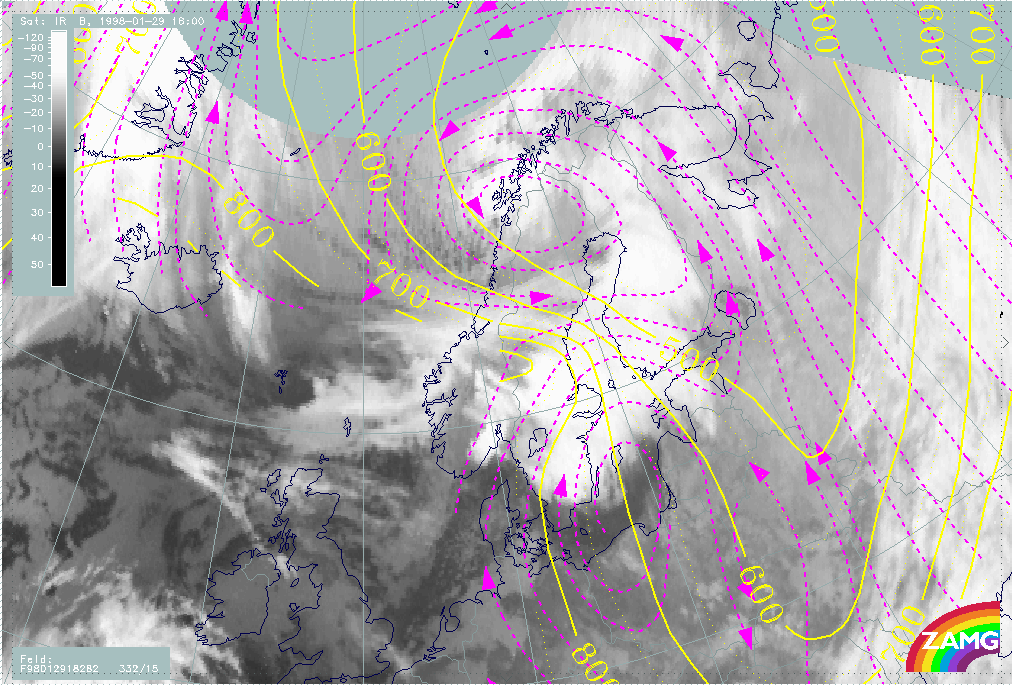 29 January 1998/18.00 UTC - Meteosat IR image; magenta: relative streams 282K - system velocity 332° 15 m/s, yellow: isobars