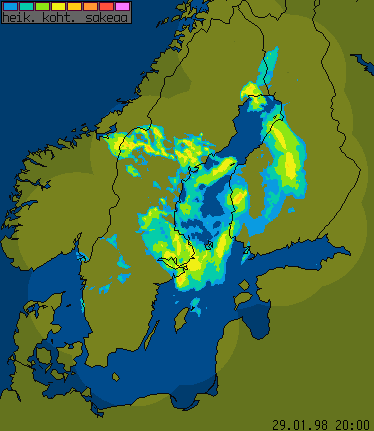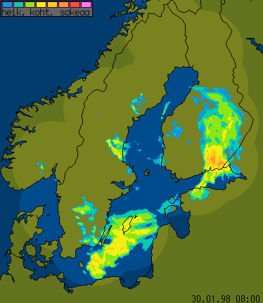 29 January 1998/18.00 UTC - Nordic radar network (NORDRAD) image; blue to magenta: light and heavy precipitation