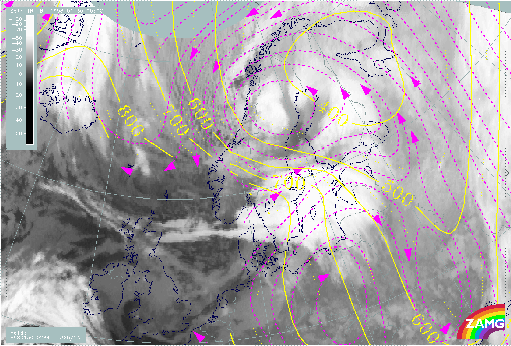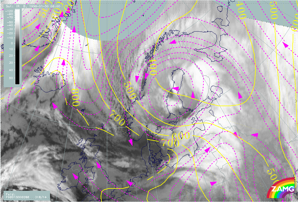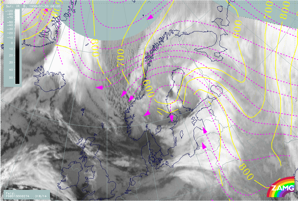 30 January 1998/06.00 UTC - Meteosat IR image; magenta: relative streams 274K - system velocity 318° 14 m/s, yellow: isobars