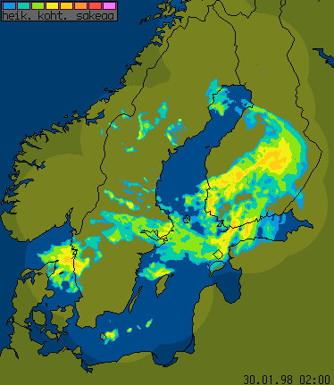 30 January 1998/00.00 UTC - Nordic radar network (NORDRAD) image; blue to magenta: light and heavy precipitation