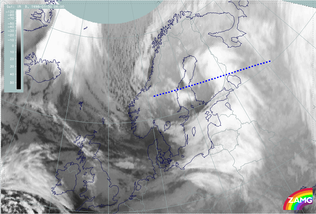 30 January 1998/06.00 UTC - Meteosat IR image; position of vertical cross section indicated