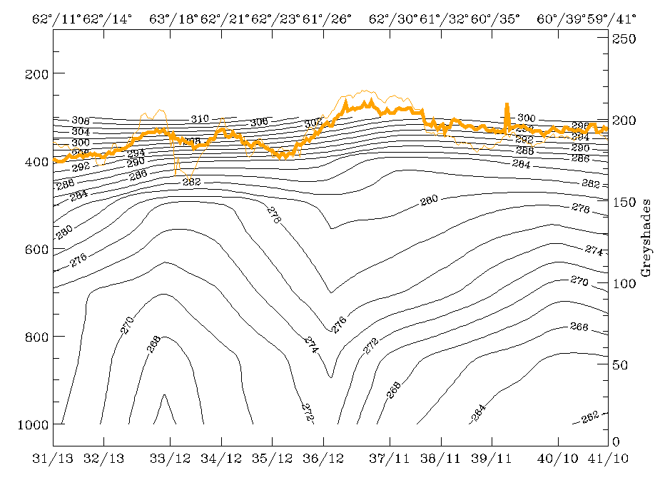 30 January 1998/06.00 UTC - Vertical cross section; black: isentropes (ThetaE), orange thin: IR pixel values, orange thick: WV pixel