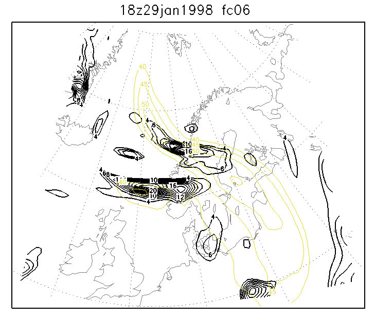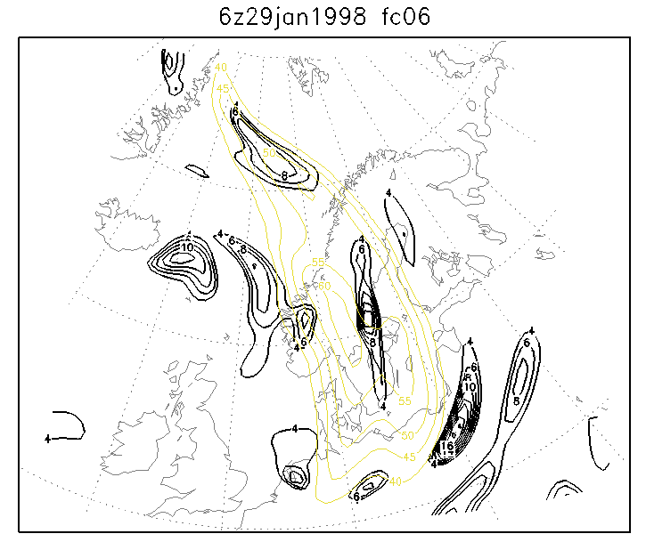 29 January 1998/06.00 UTC - Six-hourly HIRLAM forecast; yellow: isotachs 300 hPa, black: positive vorticity advection (PVA) 300 hPa