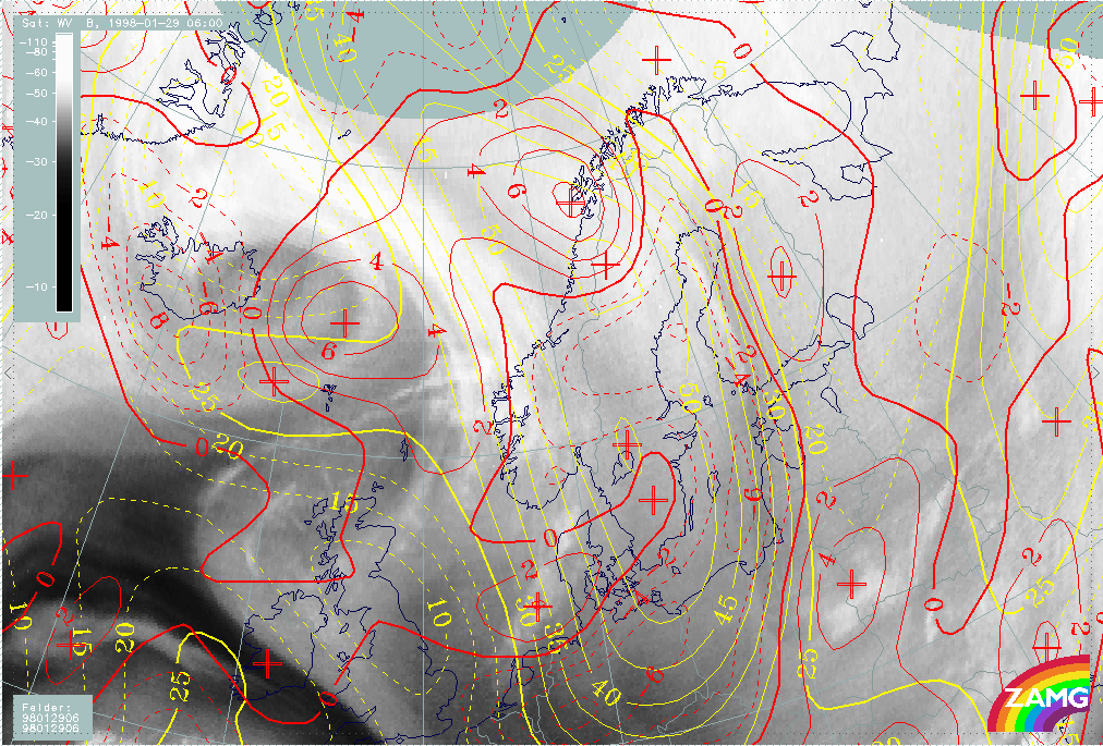 29 January 1998/06.00 UTC - Meteosat WV image; yellow: isotachs 300 hPa, red: vorticity advection 300 hPa