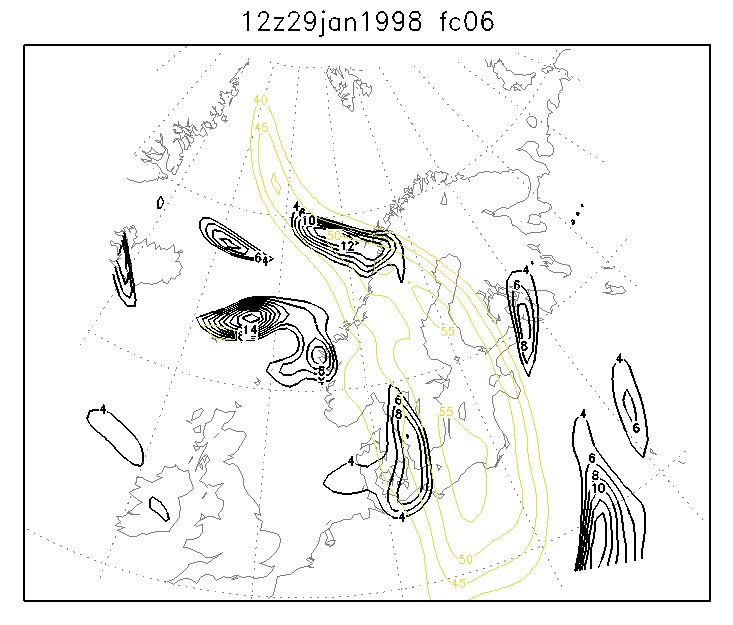 29 January 1998/12.00 UTC - Six-hourly HIRLAM forecast; yellow: isotachs 300 hPa, black: positive vorticity advection (PVA) 300 hPa