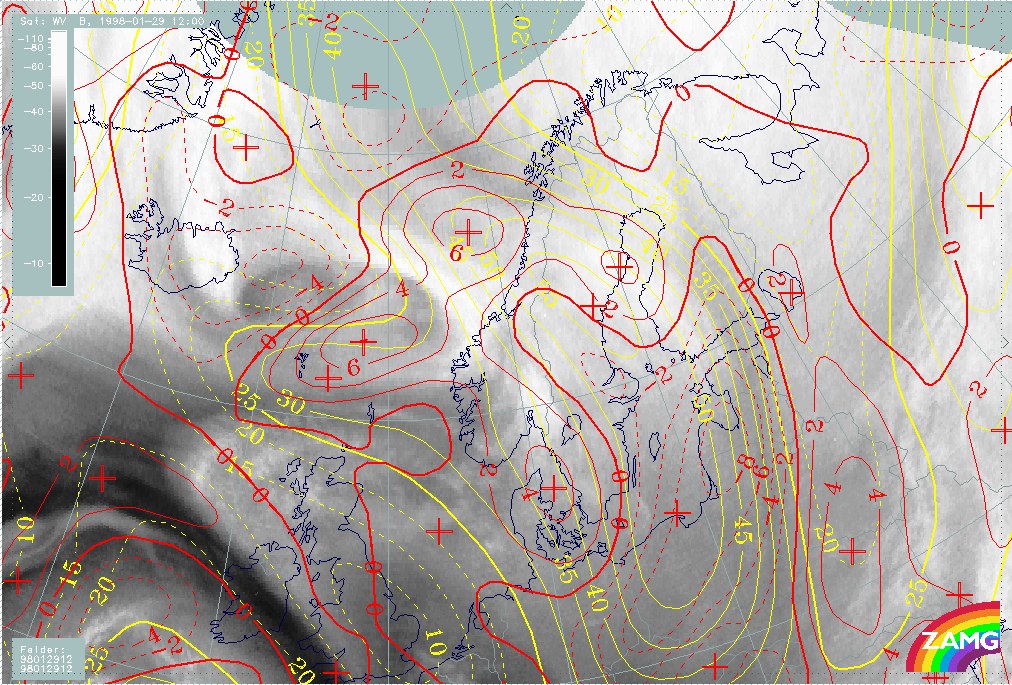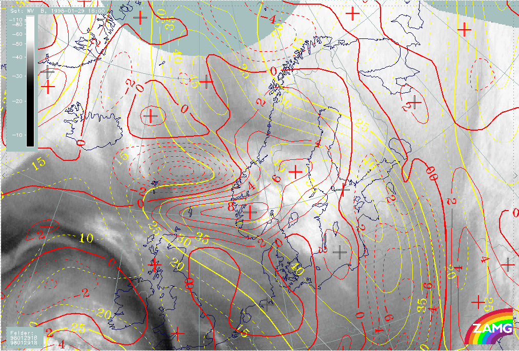 29 January 1998/12.00 UTC - Meteosat WV image; yellow: isotachs 300 hPa, red: vorticity advection 300 hPa